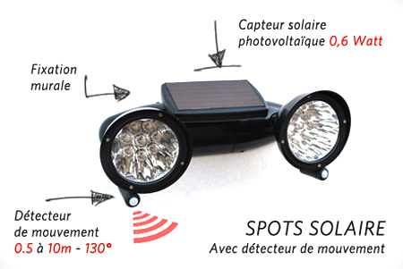 Spot solaire puissant 2 lampes 560 lumens - détecteur de ... from www.objetsolaire.com Un détecteur de mouvement peut être utilisé par des particuliers pour anticiper des possibles agressions, vols ou intrusions et prévenir du danger. La portée de ce détecteur de mouvement solaire peut atteindre jusqu'à 7 mètres grâce à la qualité exceptionnelle de son capteur. Le panneau solaire durable résiste aux intempéries et continue d'absorber l'énergie solaire, même par temps nuageux. Si vous ne voulez pas vous ennuyez avec les différents câblages, le modèle de détecteur de mouvement solaire holan 12 led sans fil est fait pour vous. Toutes les solutions pour lutter contre le cambriolage sont sur leroymerlin.fr. Vous avez déjà pensé à éclairer votre porte d´entrée ou allée avec une lampe d´extérieur qui s´allume au moindre mouvement ? Obtenez un éclairage d'appoint dans un endroit sans électricité, ni installation. Télécharger la fiche technique pdf avec détecteur de mouvement 2 modes !